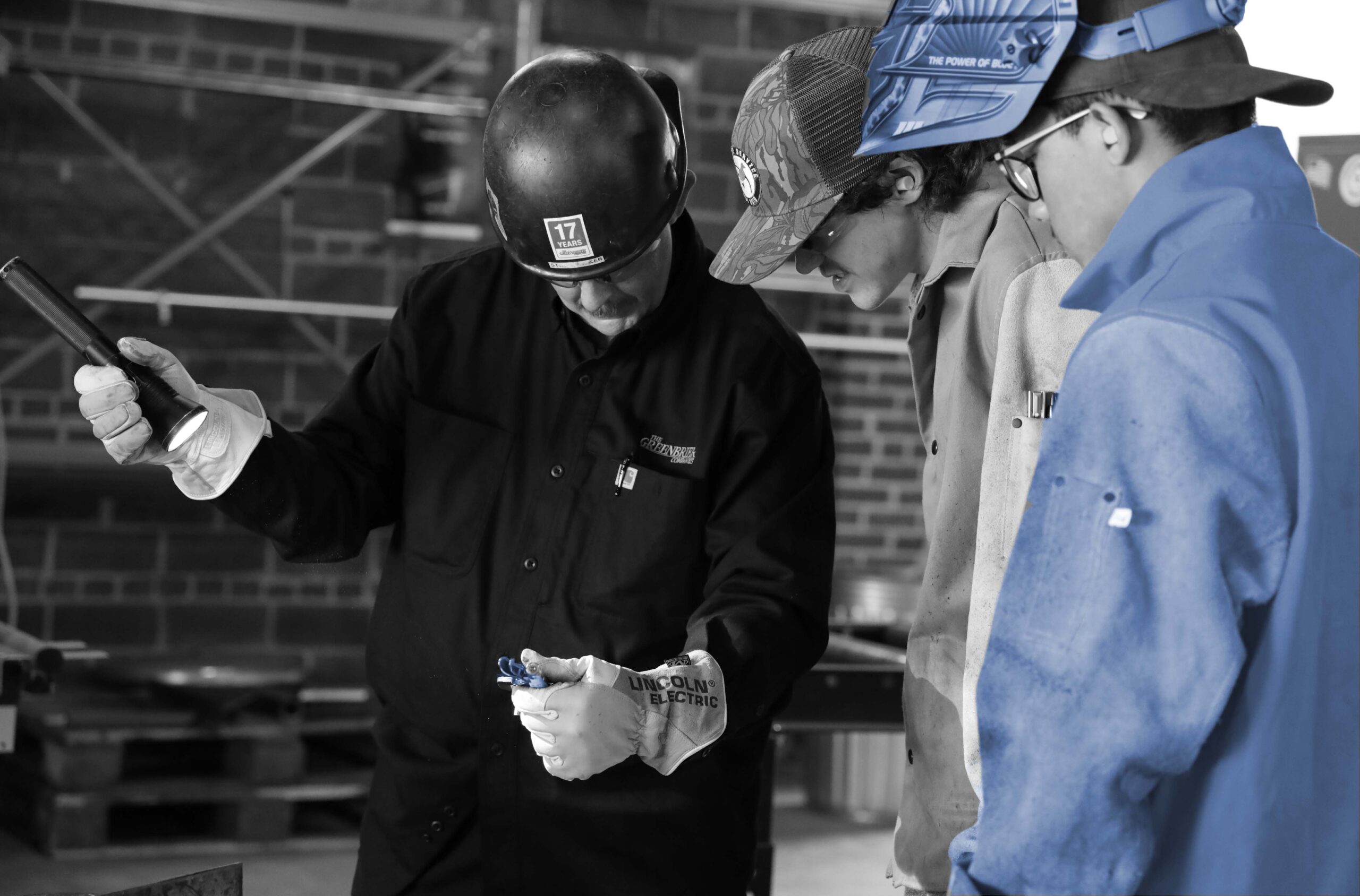 Kiker teaching welding students bW and blue